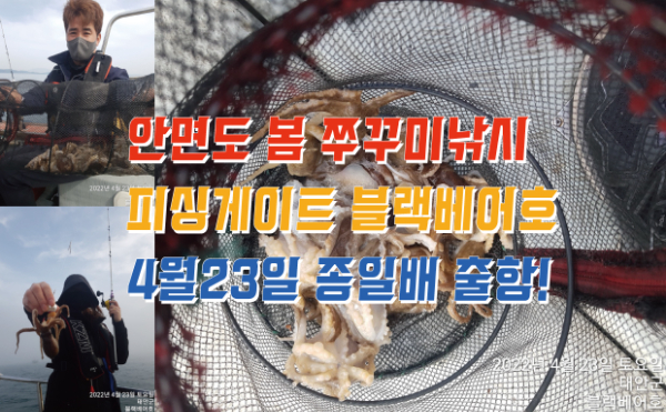 |             안녕하세요 4월23일 봄 쭈꾸미낚시 출항한 피싱게이트 선단의 블랙베어호 12명의 조사님들과 함께 산란 쭈꾸미낚시 다녀왔습니다. 봄 산란 쭈꾸미는 가을때와 달리 머리에 알을 품고있어 쭈꾸미가 예민하여 많은 조황은 얻지 못하지만 그래도 열심히 낚아 주신 조사님들께 감사드립니다. 장원 23마리 하였고 모두 10수 내외로 많은 조황은 아니였습니다. 생각보다 작은 씨알의 쭈꾸미들이 낚였 아쉬움도 있었지만 열심히 낚아 주시고 고생해 주신 조사님들께 다시 한번 감사드립니다. 안면도 봄 쭈꾸미낚시 5월11일 부터는 금어기이니 물때 좋은 주말 5월~7,8,9,일 한번 더 출항 예정입니다. 많은 이용 부탁드립니다. 감사합니다.  ■ 안면도 No.1 대형선단 15척 이상 항시대기 ■ 피싱게이트 예약문의 : 010 - 4757 - 4753 ■ 피싱게이트 사무실 : 충남 태안군 안면읍 백사장 1길 47 1층 피싱게이트 ■ 출항지 : 방포항, 내포항(라암도항), 구매항, 영목항